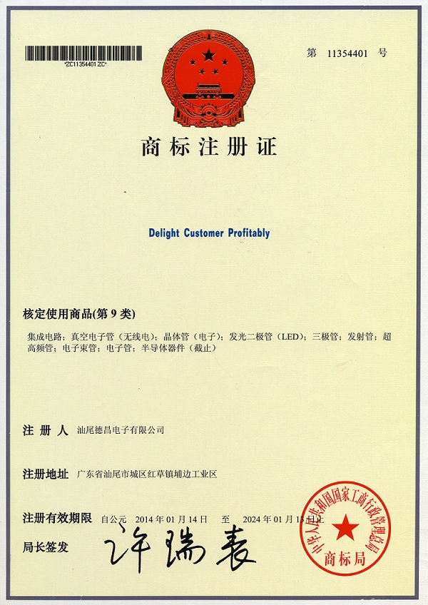 是汕尾德昌電子有限公司在中國的注冊商標(biāo)之一,受法律保護(hù),侵權(quán)必究。 未經(jīng)汕尾德昌電子有限公司書面許可,任何單位和個(gè)人不得以任何方式或理由對(duì)該商標(biāo)